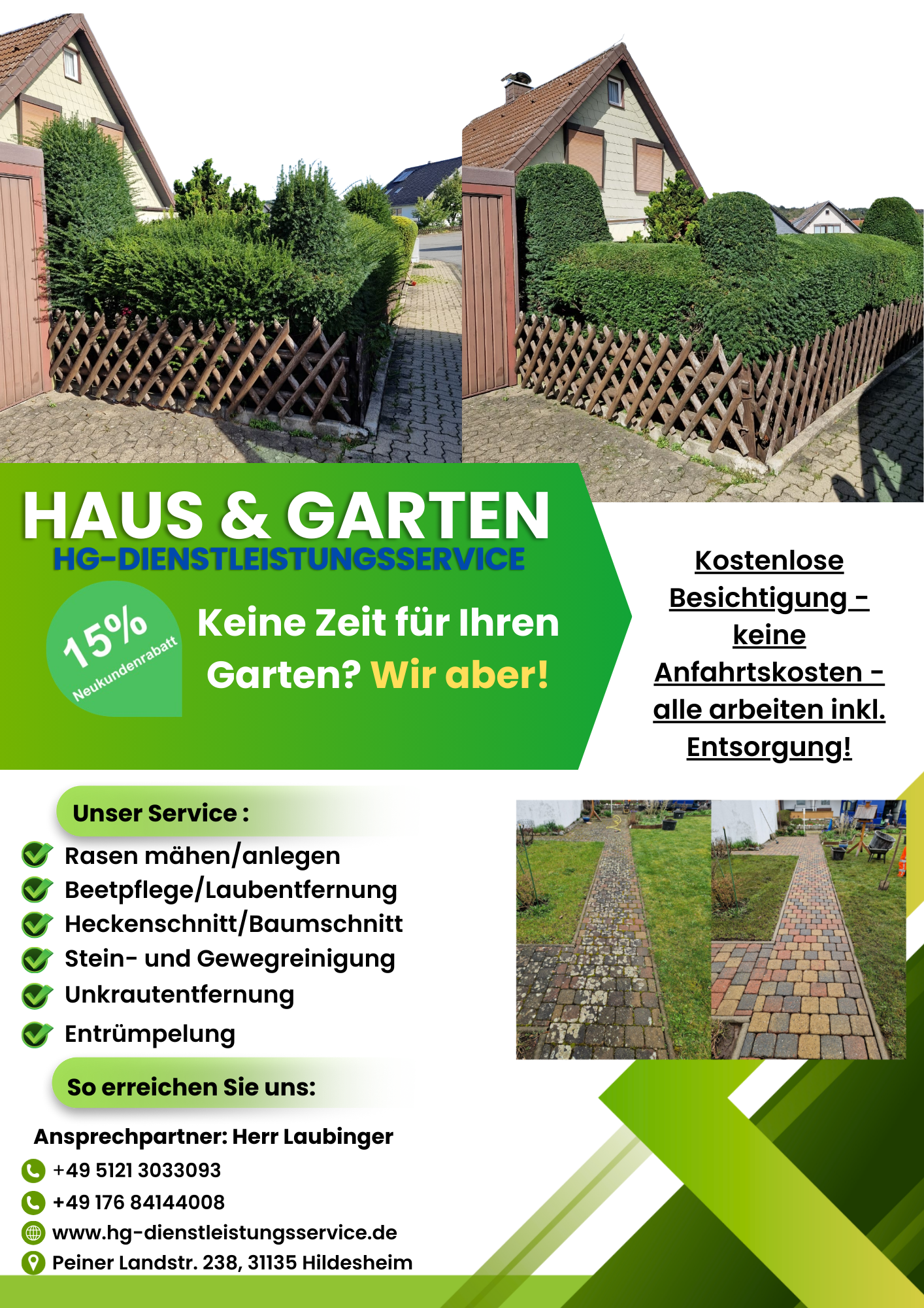 HG Dienstleistungsservice ist ein langjähriges Kleinunternehmen welches sich auf Gartenarbeiten spezialisiert hat, des weiteren bieten wir auch Entrümpelungen, Kleinumzüge, Baustellenreinigungen, Steinreinigung von Einfahrten und Gehwegen, kleine Pflasterarbeiten und auch einige weitere arbeiten an.